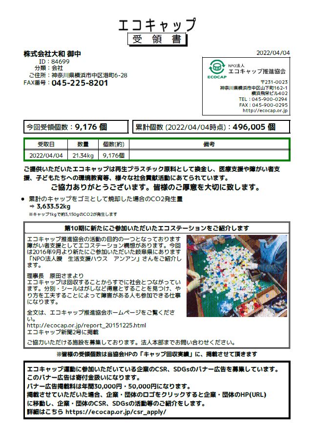 弊社ではボランティアの一環としてキャップを集め、NPO法人エコキャップ推進協会のエコキャップ運動に参加しております。 2016年より開始し、今回で約49.6万個になりました。 これからもキャップ集めを通して、再資源化に貢献すると共にマイクロプラスチック問題等、考える機会にしています。