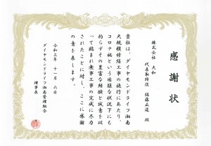 ダイヤモンドライフ湘南管理組合様より、竣工の式典を開催していただき、感謝状をいただきました。 管理組合様をはじめとする居住者の皆様には、工事へのご理解・ご協力を賜り、また温かいお心配りに、社員一同御礼申し上げます。 これからもお客様にさらなるご満足をお届けできるよう、気を引き締め行ってまいります。